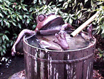 執念の捜索で入浴カエル発見!【福岡発=げこげこ大王直筆】大王様は、ぴのこ同志記者とともに、正月2日から、ただちに現場に向かった。新年早々からカエルのために出動するなんて、とても縁起がよいぞ!佐賀県の古湯温泉は、古くは斎藤茂吉が逗留して、たくさんの短歌を残した山間の静かな温泉だ。さっそくカエルを捜索して、町の人に尋ねて、まずは、川縁にあるひとつを発見した。これは、けろっぴによく似ているカエルで石製だ。記念写真を撮影した後に、もうひとつを捜索するが、なかなか見つからない。 再び、町の人に尋ねると『ああーそこの水車小屋のところにあります』と教えてくれた。 大王様一行が分からなかったのも無理はない。かなり分かりにくい場所に、彼はいたからだ。通りからはまず目に付かない。執念で探さなければ、彼を発見することはかなり困難だ。 彼は、池の中央に島のように浮かぶ石の上に、桶があって、その桶の中に、ざんぶりと、つかっている。頭にはタオルを乗せて、かなり気持ちよさそうだ。桶には樋がひいてあり、温泉を擬した水が注がれている。背後の茂みにはスピーカーが隠してあるのだろうか。カエルの鳴き声がずっと響いている。とっても楽しいカエルだ。なんてユーモラスなんだろう! 入浴カエルを表通りに出そう!【全国カエル奉賛会】けれども、大王様は、思った。彼はちょっと可哀想だ。地元の人でさえ、あまり行かないようなひっそりとした場所で、じっと温泉に浸かっているのは、さみしいぞ。しかも、桶の中には、落ち葉がかなり堆積していて、ほとんど、ゴミ風呂状態だ。流れ込む水は、冷たくて、せっかく温泉地なのだから、ほんものの温泉を流し込んだらどうだろう。彼ほどのユニークなキャラクターならば、古湯温泉の中心地である、共同浴場の広場とか、とにかく中心地に移設した方が絶対によい。彼を制作した、偉大なる佐賀県の古湯温泉の人たちは、11月23日号で紹介した同じ佐賀県の江北町が、キャラクターのビッキー君を、人々が集まる、肥前山口駅に設置しているように、みんなが見てくれる、メインストリートに移設してほしいぞ。彼は、そうする価値がある、素晴らしいカエルなことは、大王様が保証する!古湯温泉は、夏には映画祭で有名な、頑張っている町なので、きっと、そのほうが素晴らしいと思うぞ!古湯温泉の方々が、かえる新聞を読んでくれたら、ぜひぜひ前向きに検討してほしいです。 踊る大捜査線番外編「カエル宅急便」を確認【福岡発=げこげこ大王直筆】12月27日号で、kei-f同志記者が指摘していた、「踊る大捜査線」にでてきた架空の宅配便業者「カエル宅急便」の存在を、大王様は、わざわざ、映画をみにいって確認した。なんと、変質女役の小泉今日子が作っていたインターネットのホームページに、フルバナー広告があったのだが、そのバナーが「Frog express」だった。もちろん副総監宅付近に出没している宅急便も、もちろん「カエル宅急便」だった。くろねこさんとこもテレビCMに、くろねこ、カエル、らくだ。を展開していることだし、カエルは、安心迅速確実を体現する「宅急便」キャラとしての地位を確実なものにしつつあるようだなーっ!! |